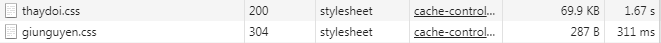 Hai CSS cũng có mã phản hồi khác nhau (cả hai đều phải kiểm tra ETag, tài nguyên không thay đổi có mã phản hồi 304, tài nguyên thay đổi có mã phản hồi là 200):