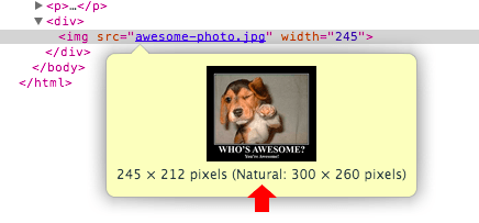 Lưu ý: đưa con trỏ chuột hover qua thành phần ảnh trong Chrome DevTools sẽ tiết lộ cả kích cỡ “hiển thị” và kích cỡ “tự nhiên” của ảnh. Trong ví dụ trên ảnh có kích cỡ 300 x 260 pixel được tải về nhưng sau đó được giảm tỷ lệ xuống 245 x 212 cho người dùng khi được hiển thị.