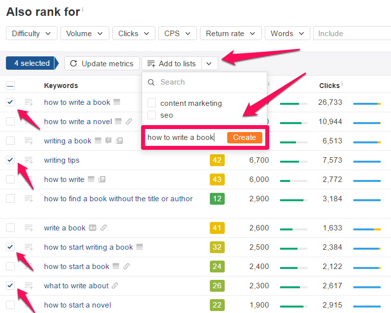 Select keywords > Add to lists > Create new list > Enter name of list > Create > Apply