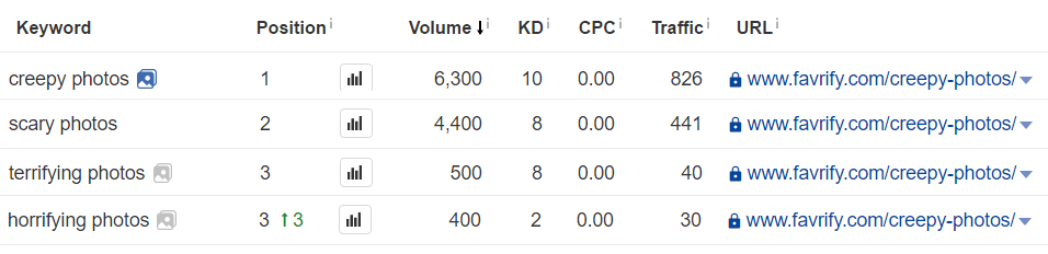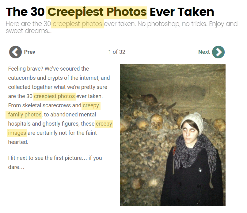 Tôi chắc chắn là bạn sẽ đồng ý rằng trang này đã được tối ưu hóa cho từ khóa ‘creepy photos’ (các bức hình đáng sợ). Các từ như ‘ghê rợn’, ‘ghê người’, ‘kinh dị’ không có trong bất cứ phần nào trên trang.