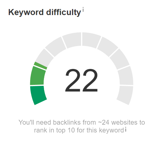 Ngay lập tức chúng ta có thể thấy từ khóa này có điểm độ khó là 22. Điều này nghĩa là chúng ta cần xây dựng liên kết từ xấp xỉ 24 trang web để thăng hạng nó lên trang đầu (thuộc top 10).