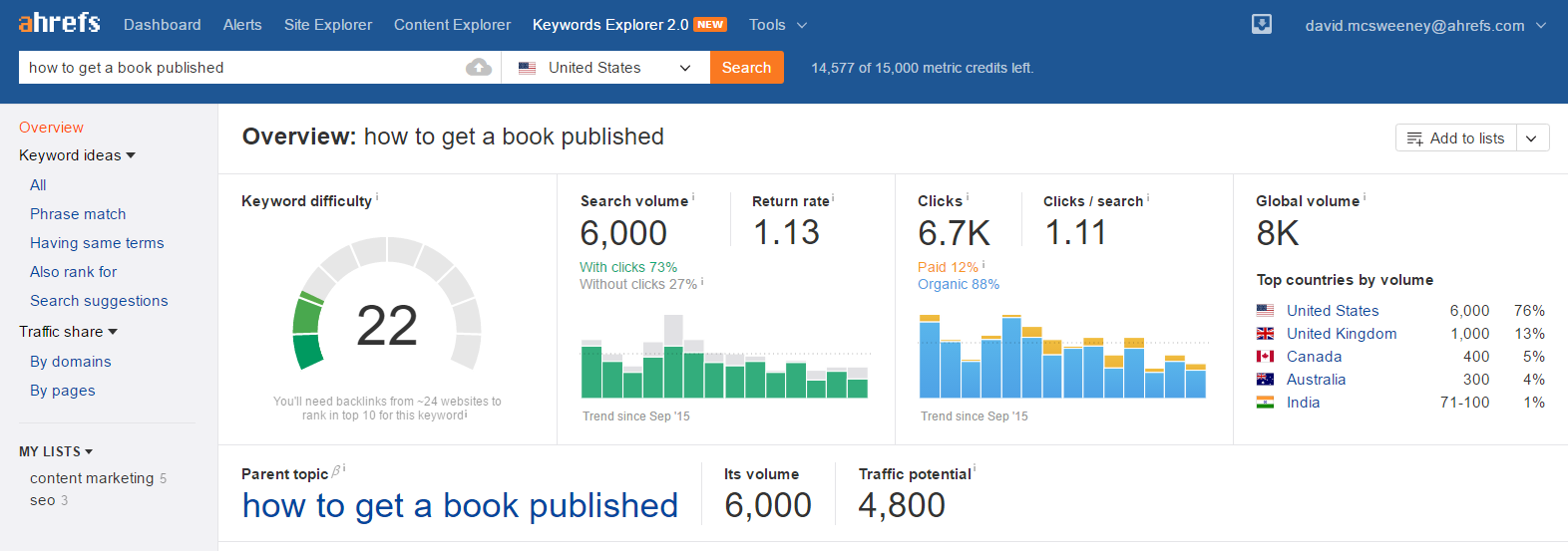 Chúng ta sẽ bắt đầu bằng việc nhập từ khóa chính ‘how to get a book published’ vào Ahrefs’ Keywords Explorer.