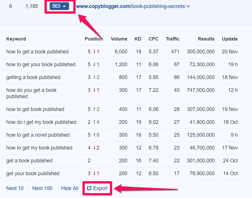 Chúng ta đơn giản click vào báo cáo ‘Also rank for‘ và sẽ nhận được một danh sách các từ khóa bổ sung mà các trang ở trong top 10 kết quả.
