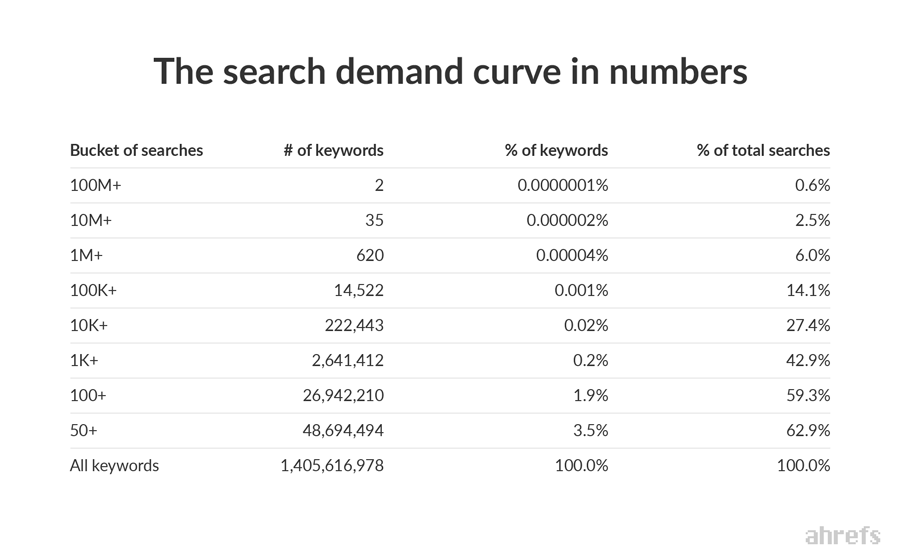 Khối lượng tìm kiếm hoặc “nhu cầu tìm kiếm” (hoặc đơn giản là “có bao nhiêu người tìm kiếm từ khóa này hàng tháng”) là điều DUY NHẤT phân biệt từ khóa “đầu to” với từ khóa “đuôi dài”.
