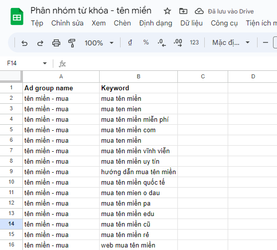 PS: Chúng ta cần lưu ý, về bản chất tính năng nhóm tự động từ khóa của Google Ads là nhóm theo sự lặp lại ngữ nghĩa của từ khóa, vì thế có khả năng bạn không chỉ có một nhóm từ khóa mua khi phân loại tự động. Ví dụ với từ khóa “tên miền”, tôi thấy Google Ads phân loại tự động có vài nhóm liên quan đến mua là “Mua tên”, “Mua Domain” và “Miền Giá Mua”.