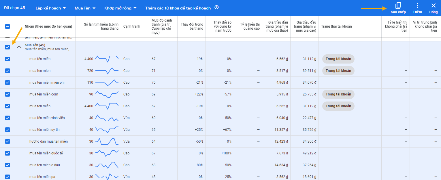 Chúng ta tìm đến nhóm được phân loại là Mua trong đầu tiêu đề, bạn click vào đó để nó xổ ra danh sách từ khóa, sau đó click vào tên nhóm để chọn tất cả từ khóa trong nhóm đó, rồi nhấn Sao chép: