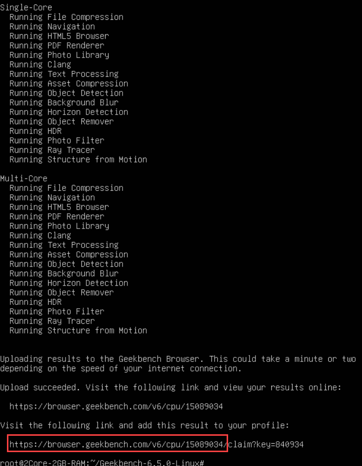 Kết quả của Geekbench sẽ không hiển thị trực tiếp trên giao diện của terminal mà qua một đường link thông báo cuối kết quả (YABS thì trích xuất kết quả và hiển thị ngay).