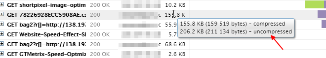Hover qua phần thông tin size để biết được kích cỡ thực / uncompressed và kích cỡ đã được nén (nếu nó có khả năng nén / compressed, trong trường hợp này chủ yếu là file CSS và JS).
