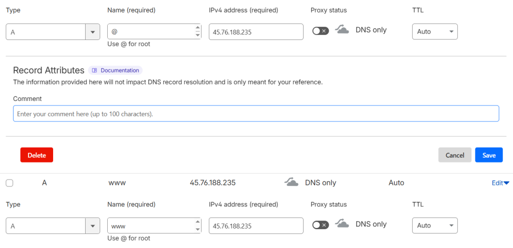Trước tiên cần vào trang quản trị tên miền của bạn, và trỏ DNS của nó về IP của VPS. Trỏ cả 2 dạng có-www và không-www bằng các bản ghi A về IP.
