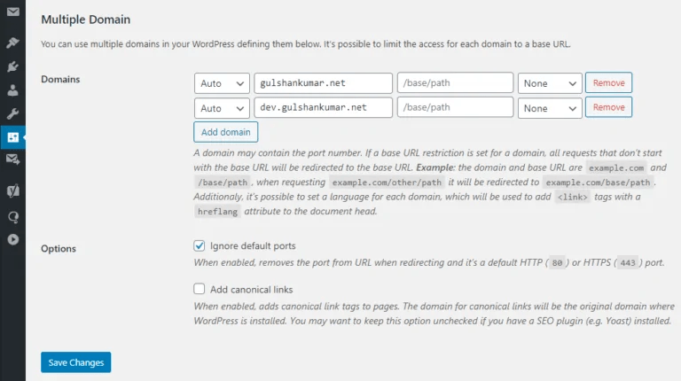 - Trong WordPress, bạn cài và kích hoạt plugin multiple domains và cấu hình như bên dưới;