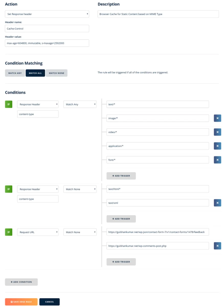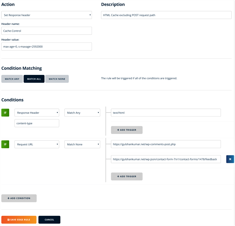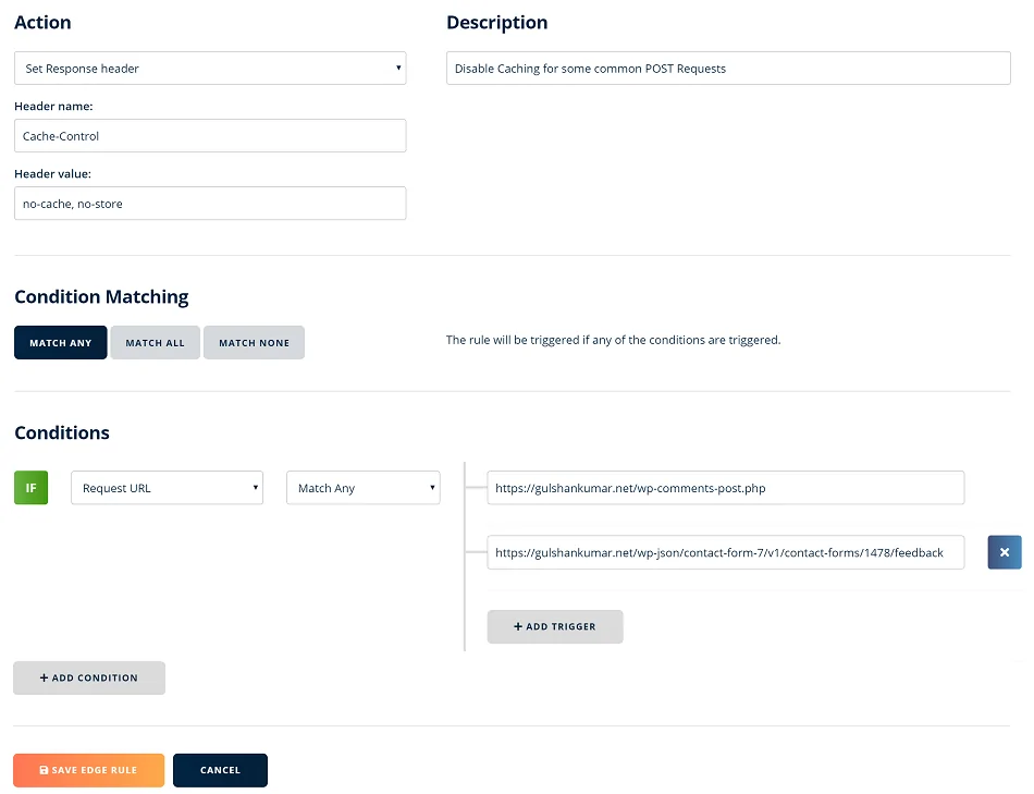text/htmlvàtext/xmlcho Sitemap; - Conditions: If Request URL (Match None) : Trigger: https://example.com/wp-comments-post.php or https://example.com/wp-json/contact-form-7/v1/contact-forms/1478/feedback;