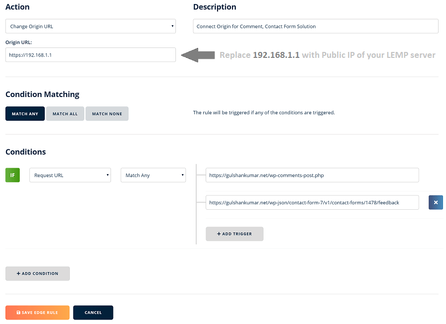 - Origin URL: nhập địa chỉ IP công khai của máy chủ gốc LEMP trong trong HTTPS scheme URL form của bạn;