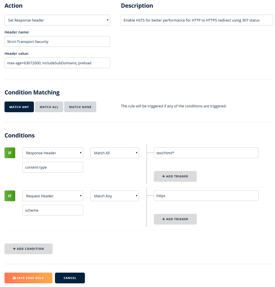 Nếu trước đó bạn sử dụng HSTS (bạn có thể vào đây để kiểm tra xem trang web gốc có đang dùng hay không), bạn nên tiếp tục sử dụng thông qua BunnyCDN. HSTS header hướng dẫn trình duyệt luôn tải request từ chỉ đường dẫn HTTPS. Bạn có thể thiết lập nó cho request text/html. Không cần làm điều này cho các tài nguyên tĩnh (ảnh, css, js).