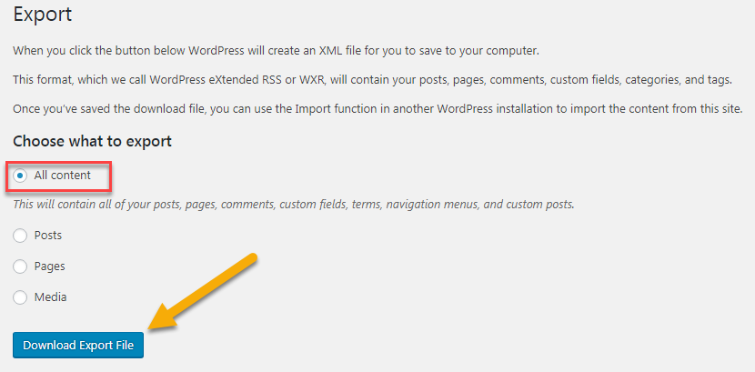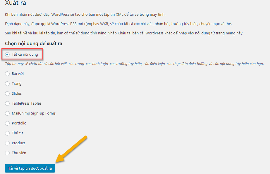 Ở khu vực chọn lựa xuất ra, bạn chọn tất cả, để WordPress xuất tất cả dữ liệu liên quan đến website (bao gồm tất cả bài viết, trang, comment, chuyên mục và thẻ…):