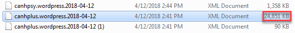 Tùy vào trang web của bạn có bao nhiêu bài viết mà chúng ta sẽ có dung lượng file .XML khác nhau. Ví dụ như trang này (www.ducanhplus.com) của mình có hơn 600 bài thì file XML của nó có dung lượng hơn 24 MB, trong khi một website khác (www.ducanhpsy.com) có hơn 50 bài, có dung lượng file XML chỉ hơn 1,3 MB, còn file XML có dung lượng 90KB là của website demo – chuyên dùng để nghịch WordPress, mới có 2 bài (1wp.ducanhplus.com):