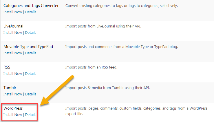 Trong trường hợp này, vì chúng ta xuất dữ liệu từ WordPress, nên chúng ta dùng công cụ nhập dữ liệu dành cho WordPress, nó là cái ở cuối cùng (bản tiếng Việt):