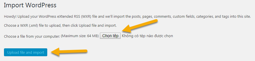Sau khi cài thành công, nó chuyển thành chữ Run Importer / Chạy trình nhập. Bạn click vào đó, rồi Chọn tệp (lấy file XML mà bạn đã xuất ở phần 1) và nhấn Upload file and Import: