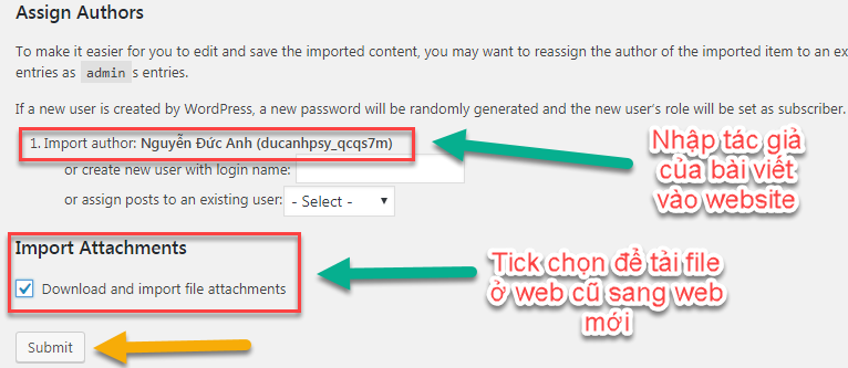 Bạn sẽ nhập khẩu các tác giả của các bài viết đang được chuyển (chỗ import author) sang web mới, mặc định các tác giả này sẽ giữ vai trò subscriber (thành viên đăng ký).
