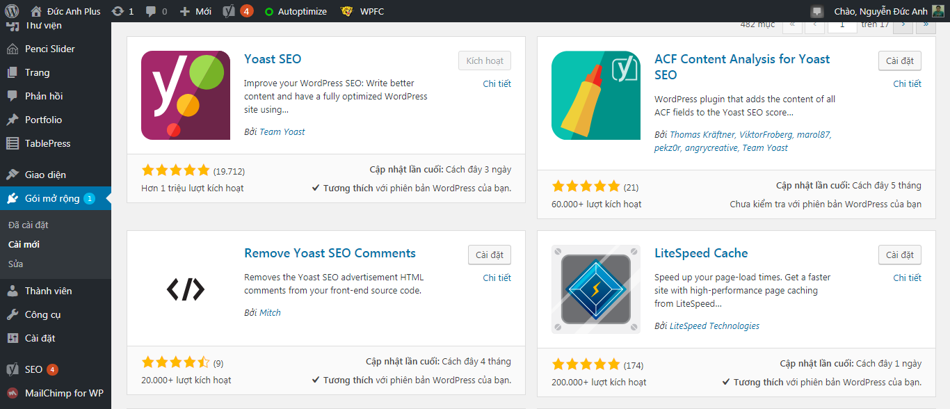 Vì tôi đã cài đặt Yoast SEO rồi nên nó có chữ “Kích hoạt”, còn bình thường thì bạn sẽ thấy chữ “Cài đặt” và nhấn vào đó để nó tự tiến hành cài cho bạn.