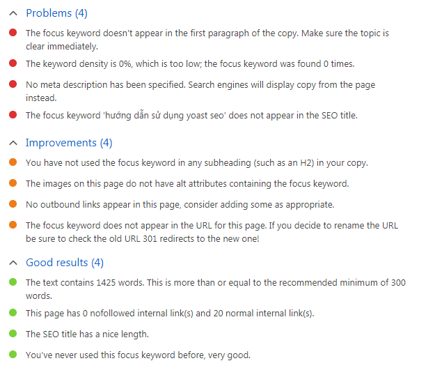 (Quên mất tôi chưa bảo các bạn, nếu các tiêu chí đáp ứng tốt bạn sẽ thấy Yoast báo nút chấm tròn màu xanh như trên, vấn đề nghiêm trọng sẽ có màu đỏ, còn vấn đề vừa phải sẽ có màu cam).