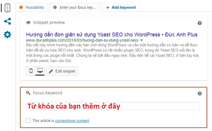 Bạn thêm từ khóa cho Yoast SEO ở phần này (Focus keyword / Từ khóa chính):