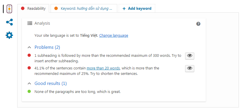 Nếu bạn chọn thêm từ khóa (đang nhắm) vào bài viết để tăng tỷ lệ %, nó có thể dẫn đến vấn đề về sự tự nhiên. Trong trường hợp này tôi sẽ thêm từ “hướng dẫn sử dụng yoast seo” vào bài sao cho ít nhất nó có chấm xanh kia.