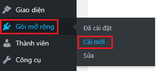 Đầu tiên để cài Yoast SEO, ở bên tay trái, ở phần panel, bạn vào Gói mở rộng > Cài mới: