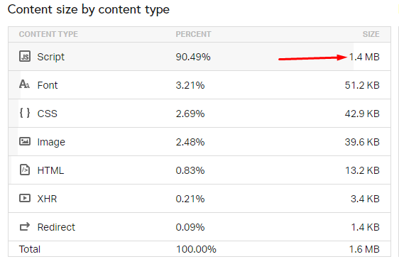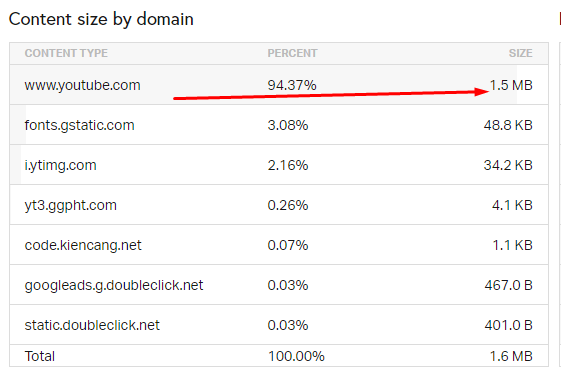 Tổng cộng YouTube tải khoảng 630 KB dữ liệu về, trong đó chủ yếu là JavaScript. Tất cả chúng có thể được coi là tài nguyên của bên thứ ba. Riêng cái HTML là của trang, không phải của YouTube, nên không được tính vào đây.